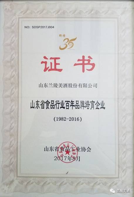 会上,山东兰陵美酒股份有限公司被授予“山东省食品行业百年品牌培育企业”的荣誉称号。