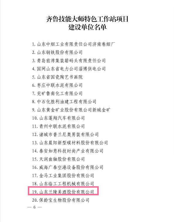 近日,山东省人力资源和社会保障厅公布“齐鲁技能大师特色工作站项目建设单位名单”,山东兰陵美酒股份有限公司成功获选。