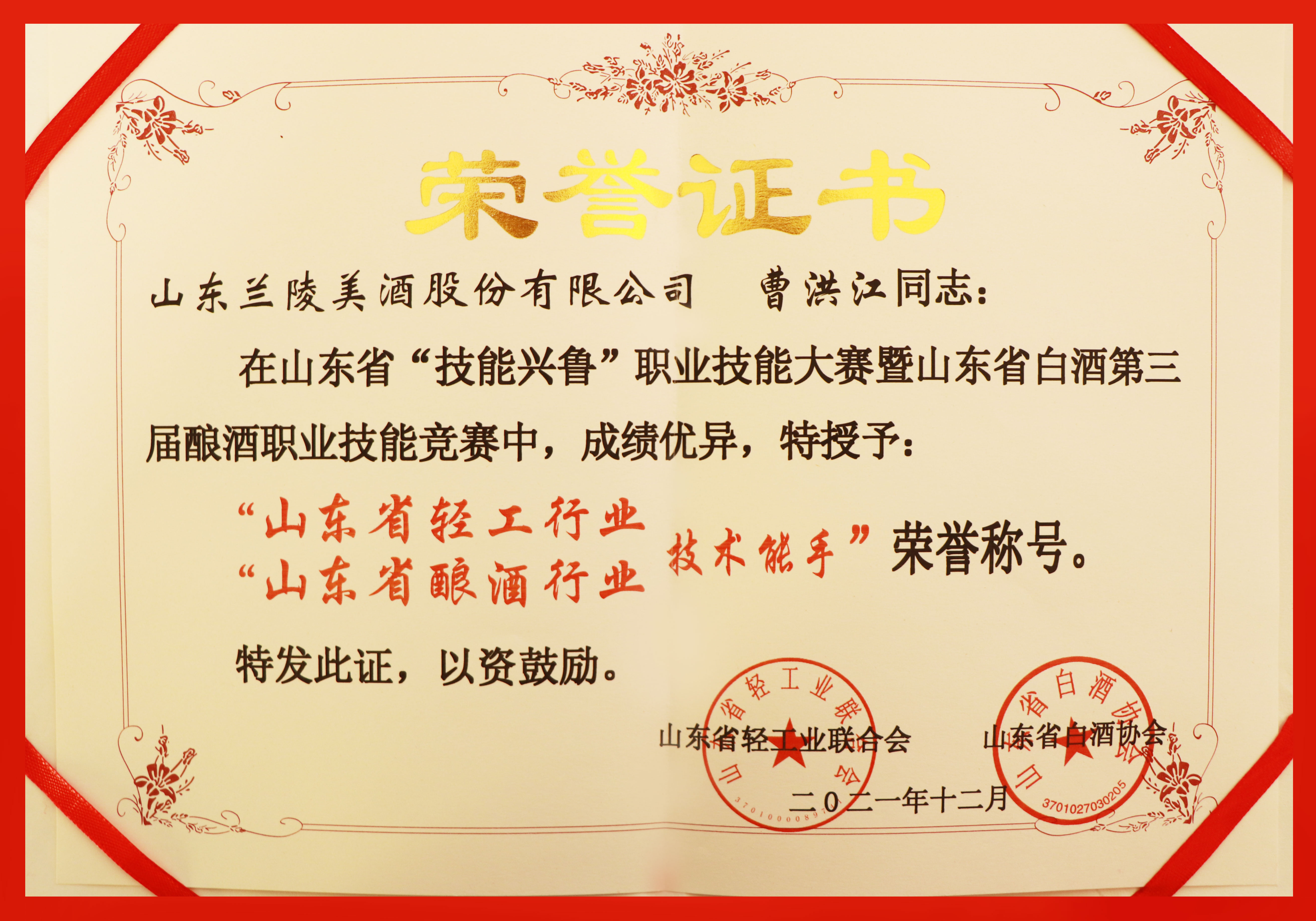 本次活动有来自山东省各地市的36支参赛队伍,共80余名优秀酿酒技术能手同台竞赛,经过装甑·摘酒技能大赛比拼和酿酒技术交流活动,山东兰陵美酒股份有限公司酿酒职工曹洪江同志脱颖而出,荣获“山东省轻工行业、山东省酿酒行业技术能手”荣誉称号。